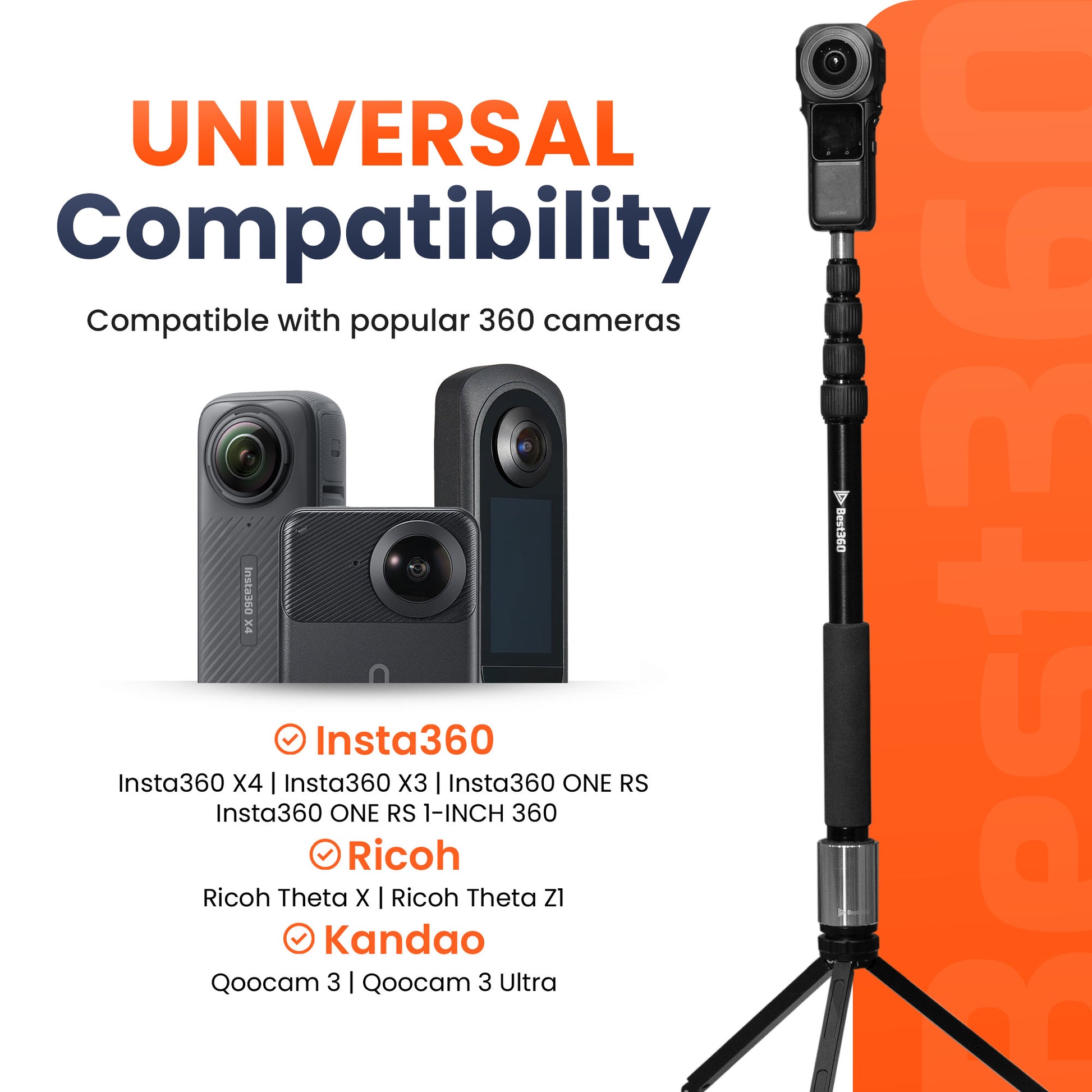 Insta360 X5, Insta360 X4, Insta360 X3, GoPro MAX 2, DJI Osmo 360, Qoocam 3 Ultra, DJI Osmo Pocket 3, Insta360 ONE RS 1-INCH 360 EDITION, Insta360 ONE RS, Insta360 ONE X2, Insta360 ONE R, Insta360 ONE X, Kandao Qoocam 8K, Ricoh Theta Z1, Ricoh Theta X, Ricoh Theta V.